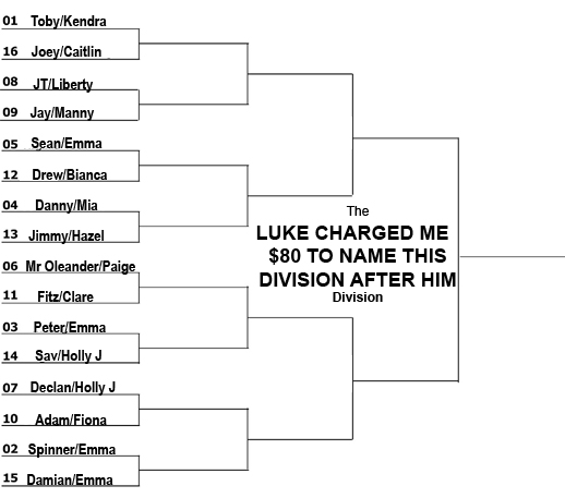 Luke, please tell Flora that we mock because we love.  This division contains THE powerhouse couple, Semma.  I’d say JT/Liberty comes in at second.  Other than that, there are a lot of couples I could care less about in this division.  One of my bold predictions is that Adam/Fiona will make it to the Elite Eight.  I think they’ll beat Declan/Holly J, then they’ll destroy one of the lame Emma couples, and should have no trouble beating whoever they’re matchup is in the Sweet 16.  But unless all of their fans died/no longer have computers, I just can’t see Semma not winning this division.