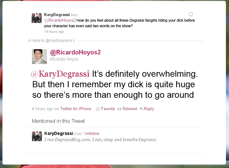 http://www.muchmusic.com/tv/degrassi/blog/interview-new-degrassi-cast-member-ricardo-hoyos/ – You can submit questions to MuchMusic which they will be asking newcomer Ricardo on Wednesday via twitter. I’m not really sure why we need to submit questions…if I wanna know something about Ricardo, I just ask him myself: