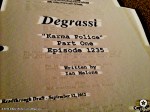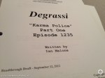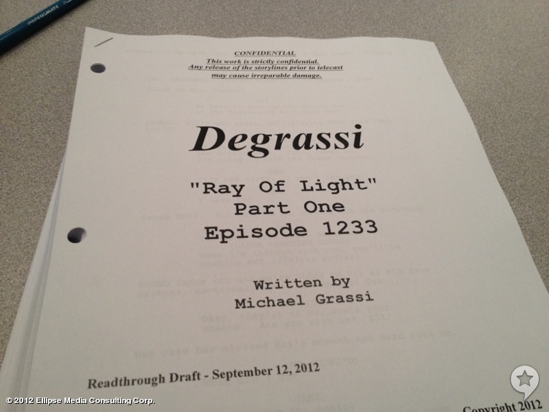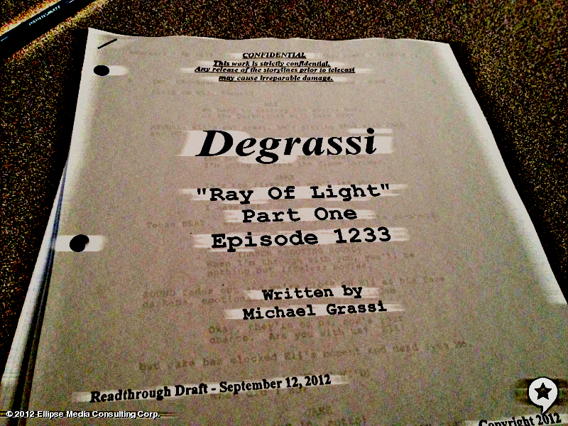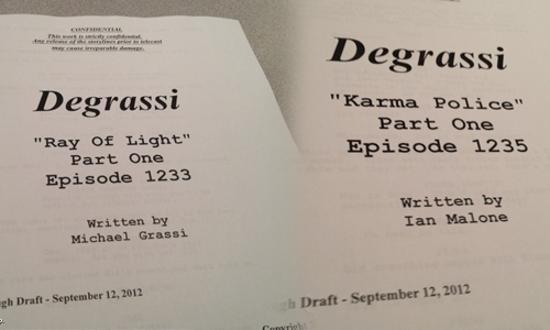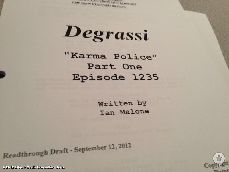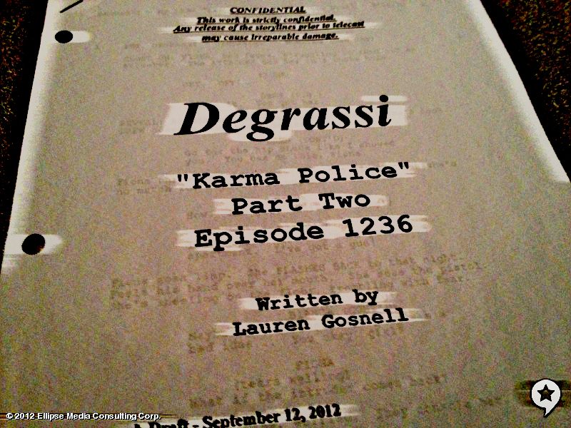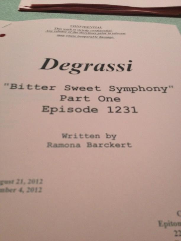 Yesterday Epitome had its Degrassi readthrough for episodes 1233/1234 (Ray Of Light) and 1235/1236 (Karma Police). We’ll find out the episode title for the Season 12 finale at the next readthrough (whenever that will be). The Stohn forgot to reveal the episode title for 1231/1232 at the last readthrough, but did so today…it’s Bitter Sweet Symphony.