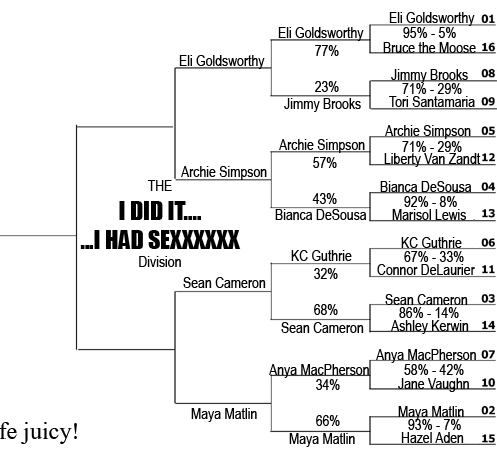 Also there is definitely momentum affecting the tournament which is fun to see. For instance, Dallas and Cam getting the #1 seed after Bitter Sweet Symphony. Maybe Cam would’ve gotten a 1 seed anyway, but prior to BSS, I’m not sure Dallas would have, which is cool. Also, Simpson (coming off of his recent performance in Ray of Light) got past Liberty and is cutting it close with Bianca, which surprises the hell out of me lol.