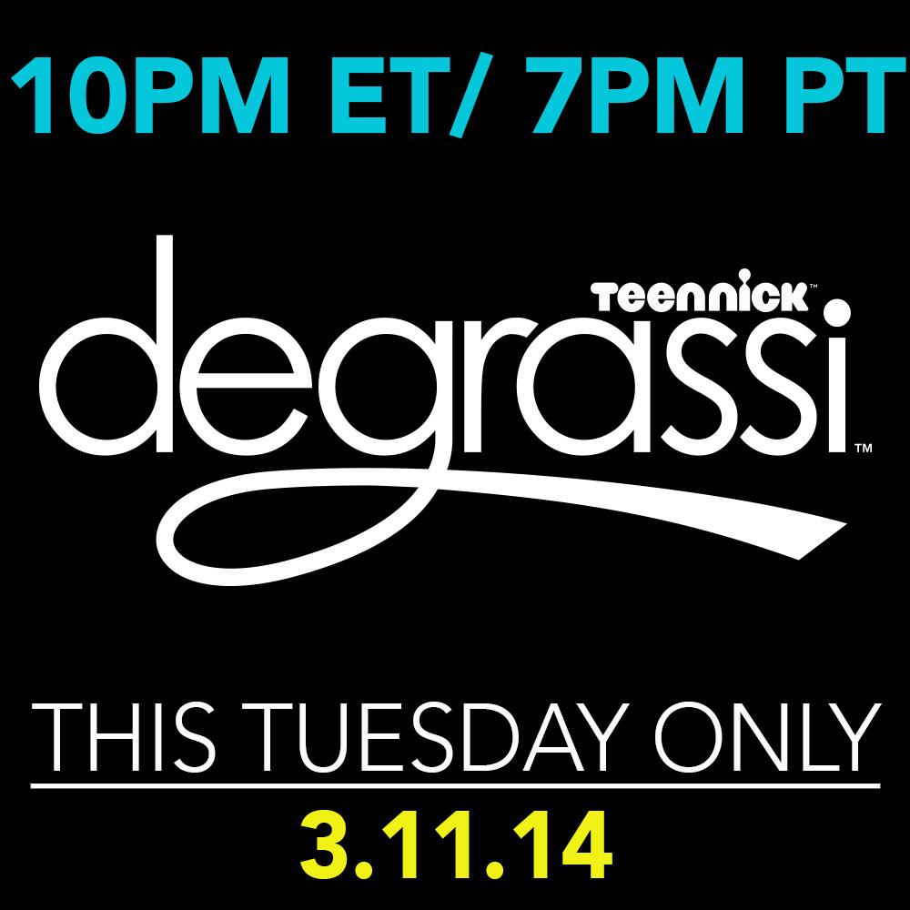 In case you missed Friday night’s announcement, TeenNick is shifting Degrassi’s timeslot this coming Tuesday, March 11th. The one-hour episode “Unbelievable” will now air at 10pm EST. So basically wherever you are in the U.S., this Tuesday’s episode will air an hour later than usual.