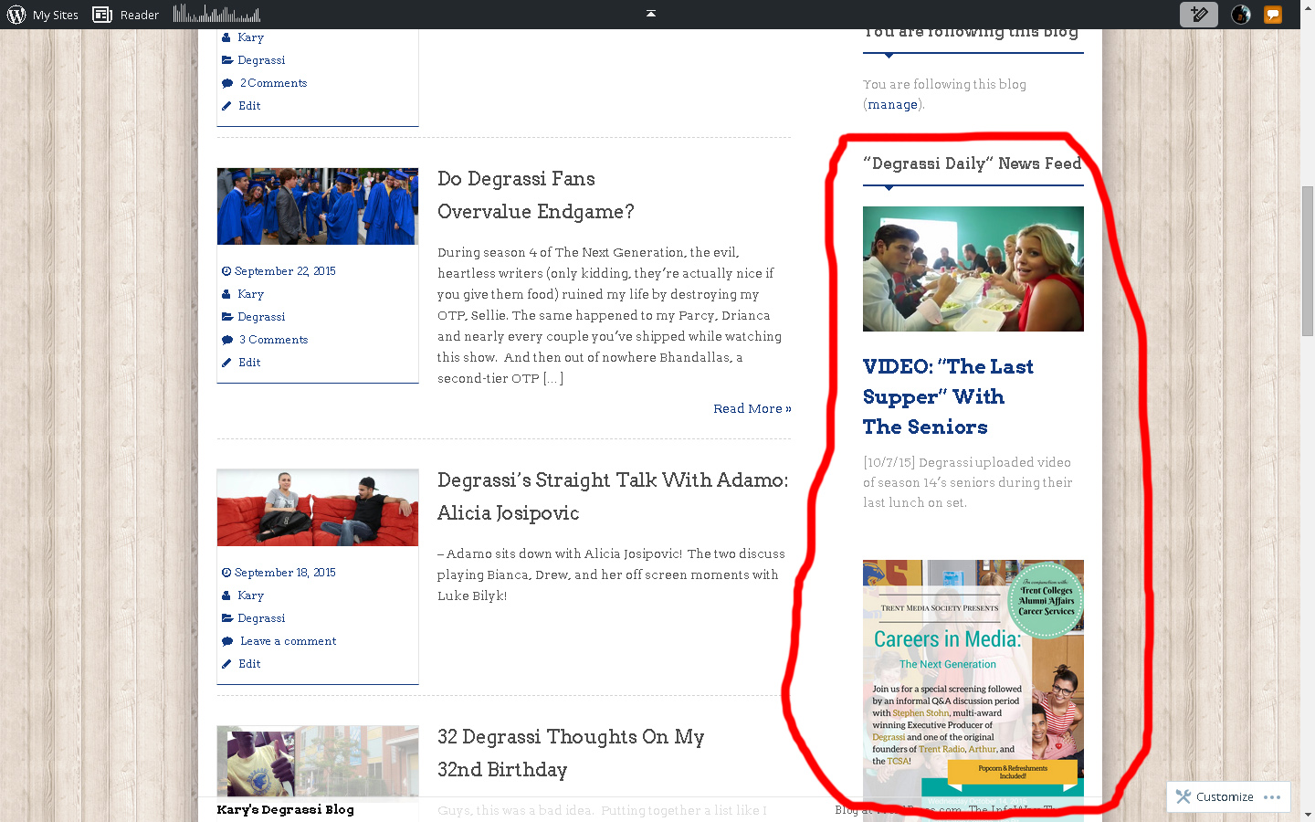 In a DegrassiBlog update, I’m working on updating the site for Next Class.  One of the new features is a second news feed in the sidebar to the right called “Degrassi Daily.”
