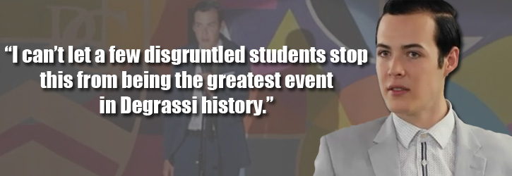 Tristan wanted to shut down the protest, Mo’s comedy routine and Manny’s song because they didn’t fit the idealistic view of Degrassi he wanted to present to the alumi. The irony is that these Degrassi almuni could tell Tristan from firsthand experience that their school is far from perfect.