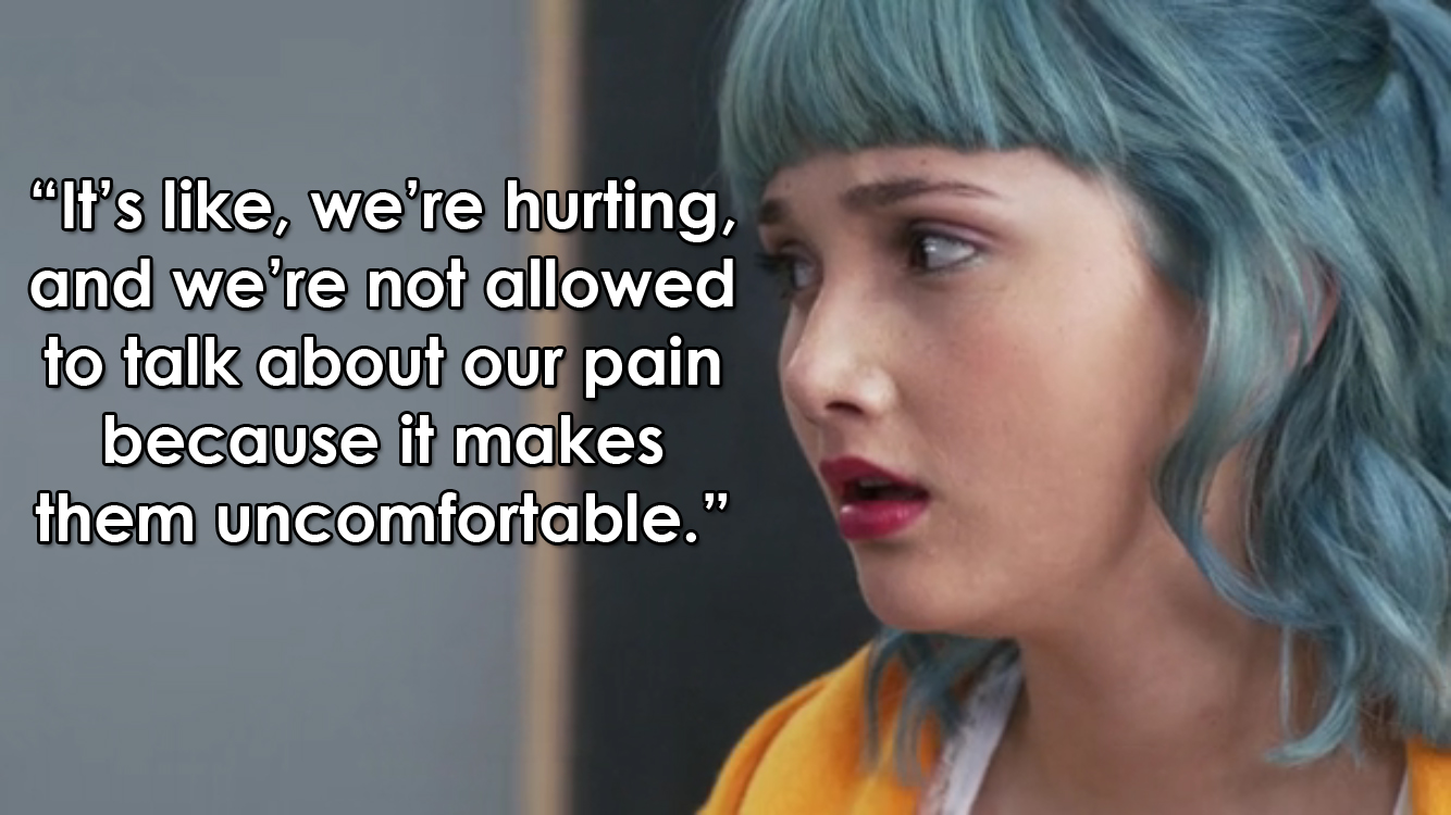 The conversation between Miles and Lola is a perfect summary of how impossible it is to fit concepts into the boxes we constantly try to place them in. “We have to care about everyone’s feelings…unless our feeling are hurting their feelings, then we’re not allowed to have any feelings,” Lola says. In a world where we’re told our feelings matter, they only matter to others when it’s important or convenient to them.